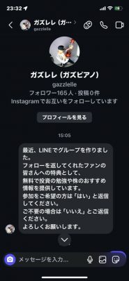 この偽アカウントはどうやら僕っぽいアイコンとプロフィールを使って、ガズファンの方々にフォロー申請をして、投資関係のLINEグループヘ誘ってくるらしいのです……。